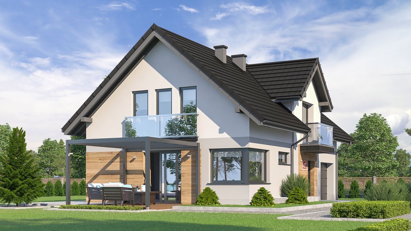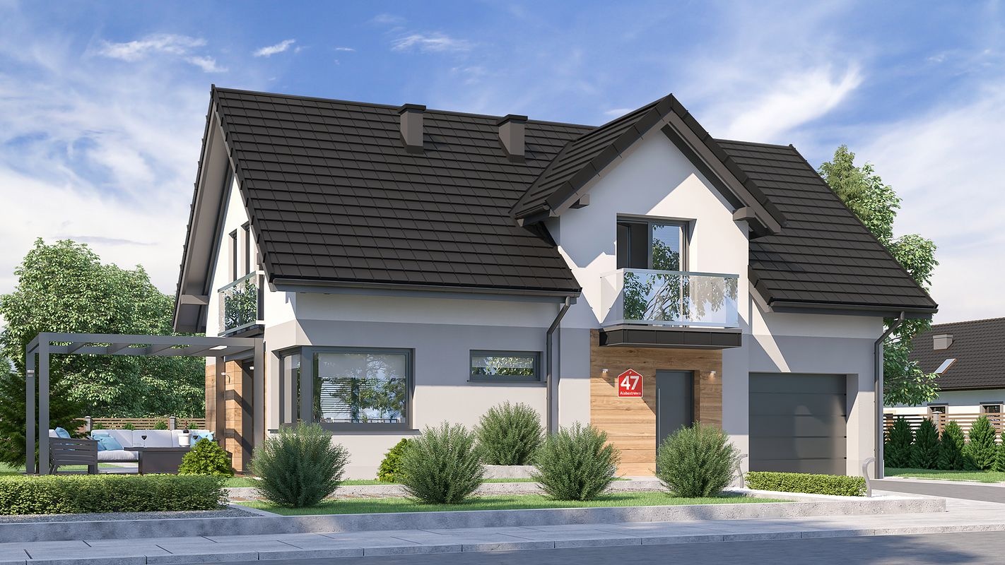 Dom przy Alabastrowej 47 to projekt nowoczesnego domu z użytkowym poddaszem, o zwartej bryle przykrytej dwuspadowym dachem z lukarną od frontu. Architektura nawiązuje do nowoczesnego stylu domów energooszczędnych. Komfort użytkowania zapewnia funkcjonalny podział wnętrza na strefę dzienną i nocną.